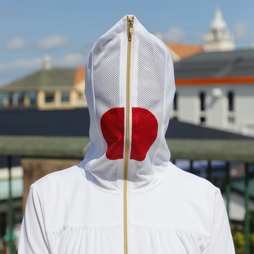 フード全面部分:目の下までファスナーを上げれば日の丸が完成。日の丸を表現した赤メッシュは貼り付け方式ではなく、難易度の高い縫い付け方式を採用し高級感ある装いに仕上げました。