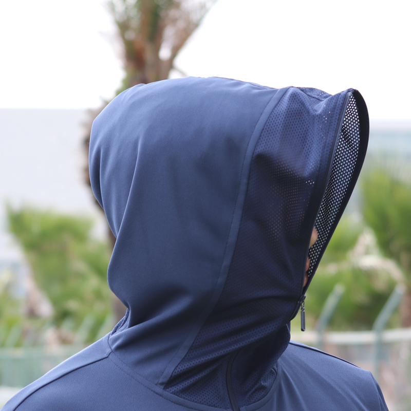 フードのファスナーを上げると顔をすっぽりとメッシュで覆い隠すことができる特殊設計(実用新案登録 登録第3240211号)。最上部までファスナーを閉めても、内側からメッシュを通して、ある程度の視界が確保されます(※UVカット機能のある特殊メッシュ素材採用)。