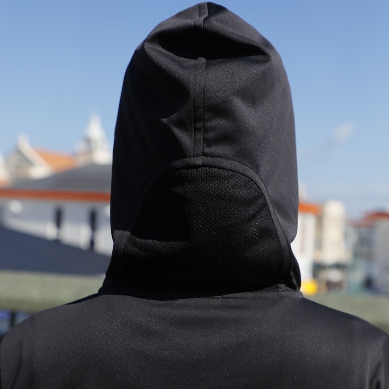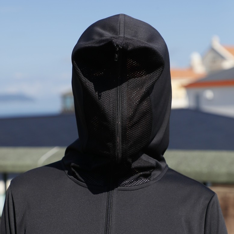 フードのファスナーを上げると顔をすっぽりとメッシュで覆い隠すことができる特殊設計。 最上部までファスナーを閉めても、内側からメッシュを通して、ある程度の視界が確保されます(UVカット機能のある特殊メッシュ素材採用)。
