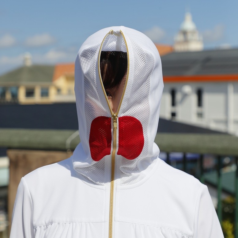 フードのファスナーを上げると顔をすっぽりとメッシュで覆い隠すことができる特殊設計(実用新案登録 登録第3240211号)。最上部までファスナーを閉めても、内側からメッシュを通して、ある程度の視界が確保されます(※UVカット機能のある特殊メッシュ素材採用)。